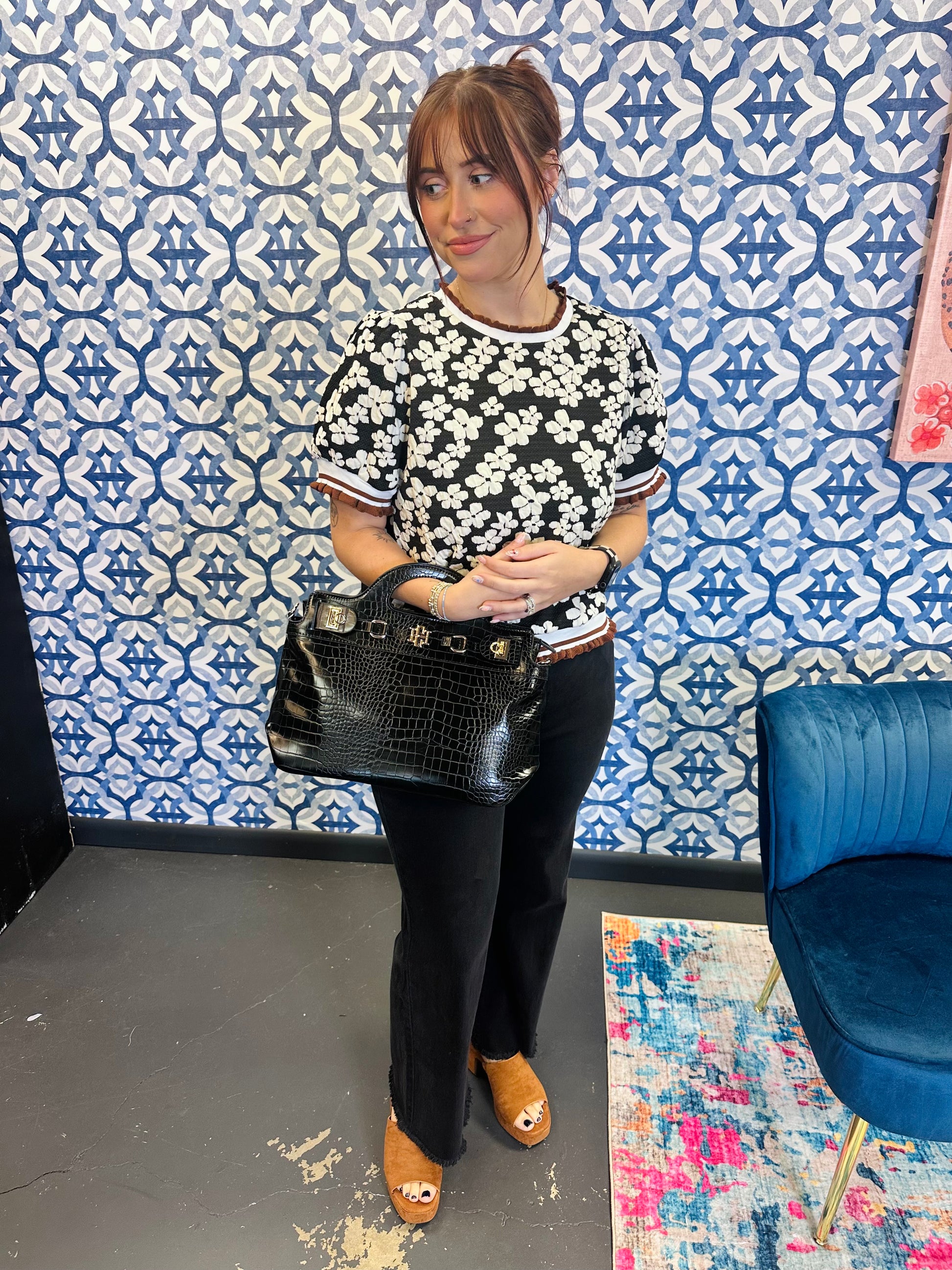 The Ellison Top is a versatile addition to your wardrobe. Its stunning floral pattern, paired with a classic black and white color combo, is sure to turn heads. The puff sleeves add a touch of elegance to any outfit. Elevate your style with this must-have top.
