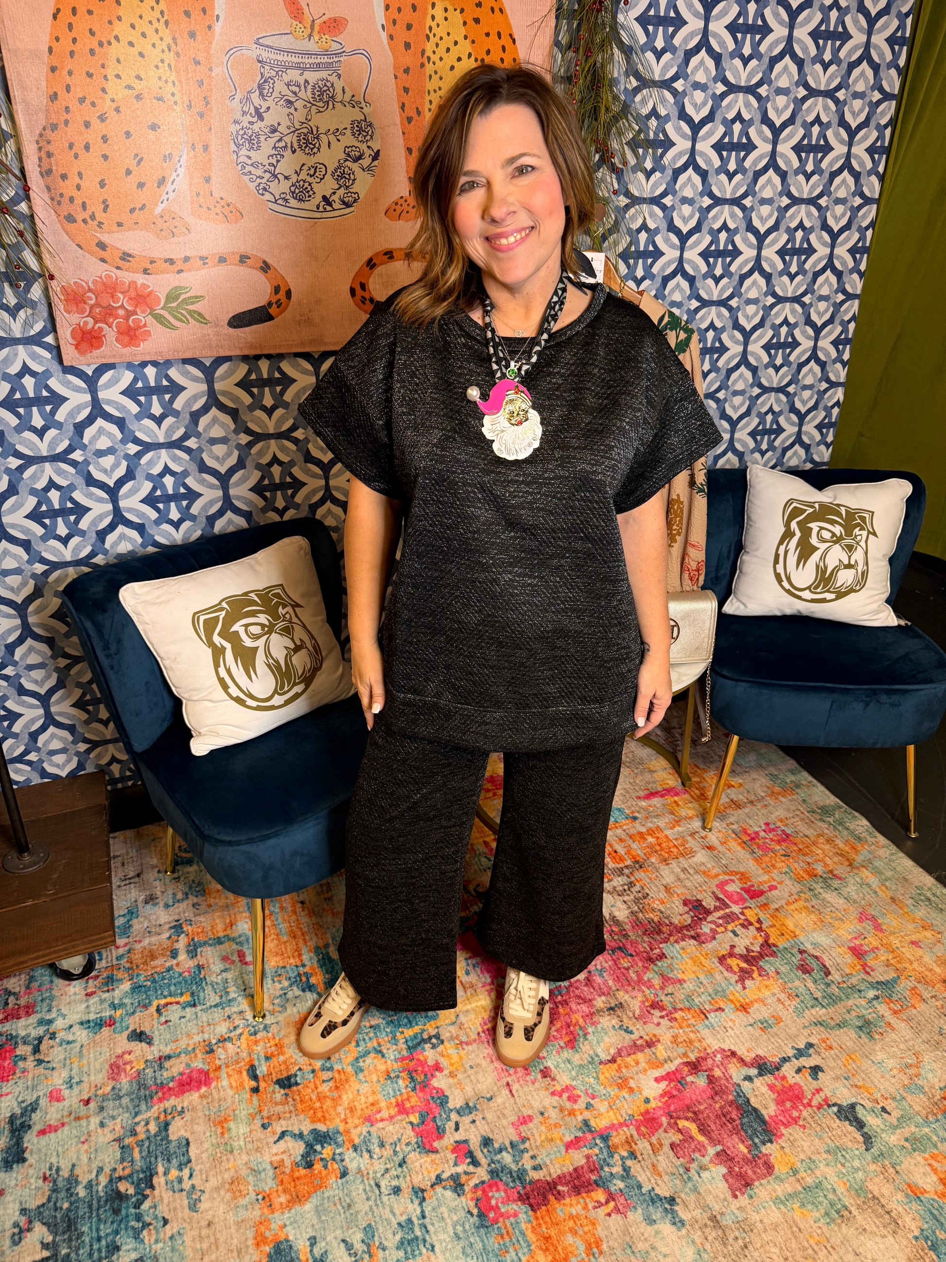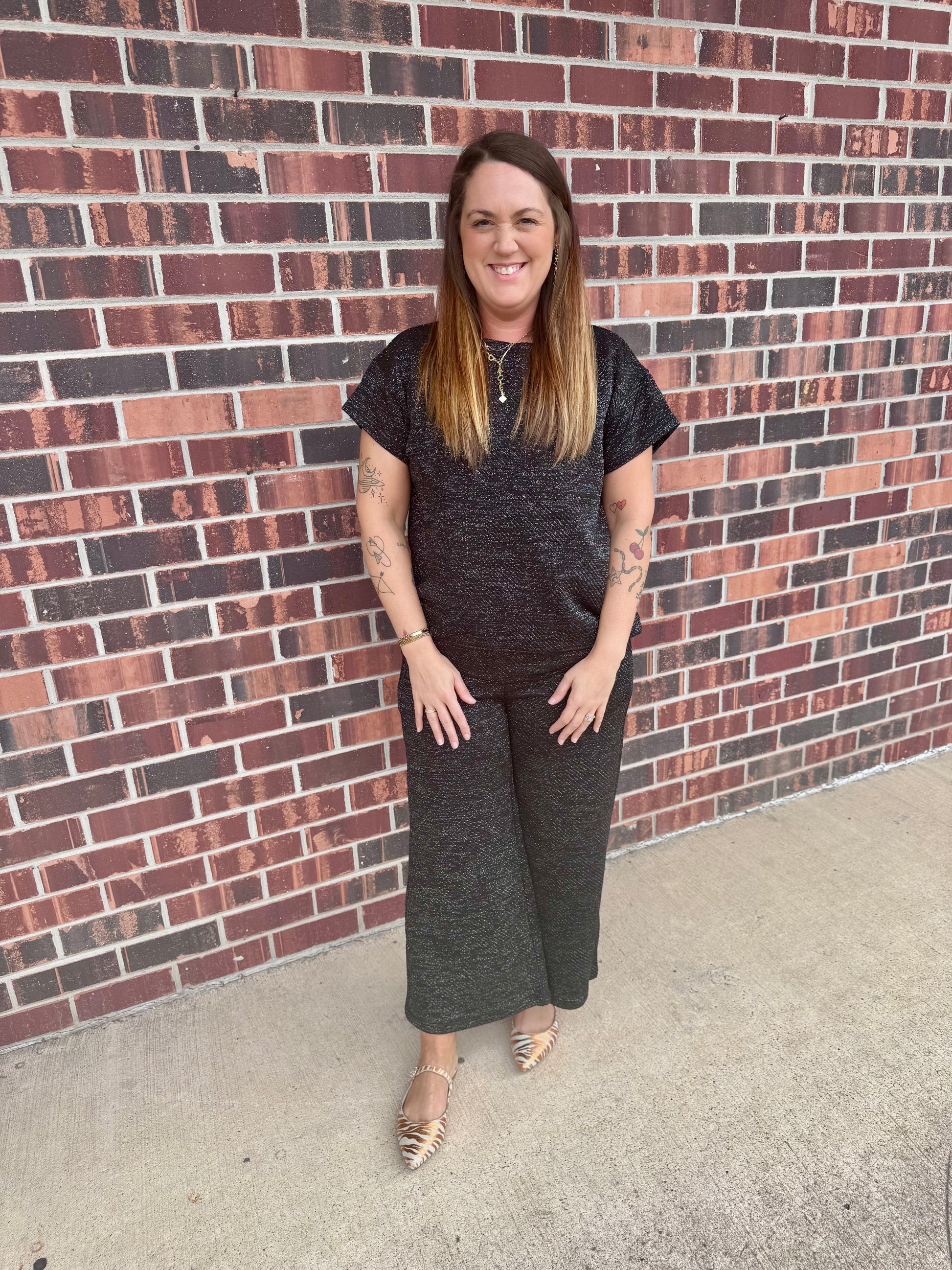 The Luxe Top offers a sophisticated look with its muted black and white design. Paired with the matching pants, this set is the perfect combination of style and comfort. Elevate your wardrobe with this timeless and versatile piece.